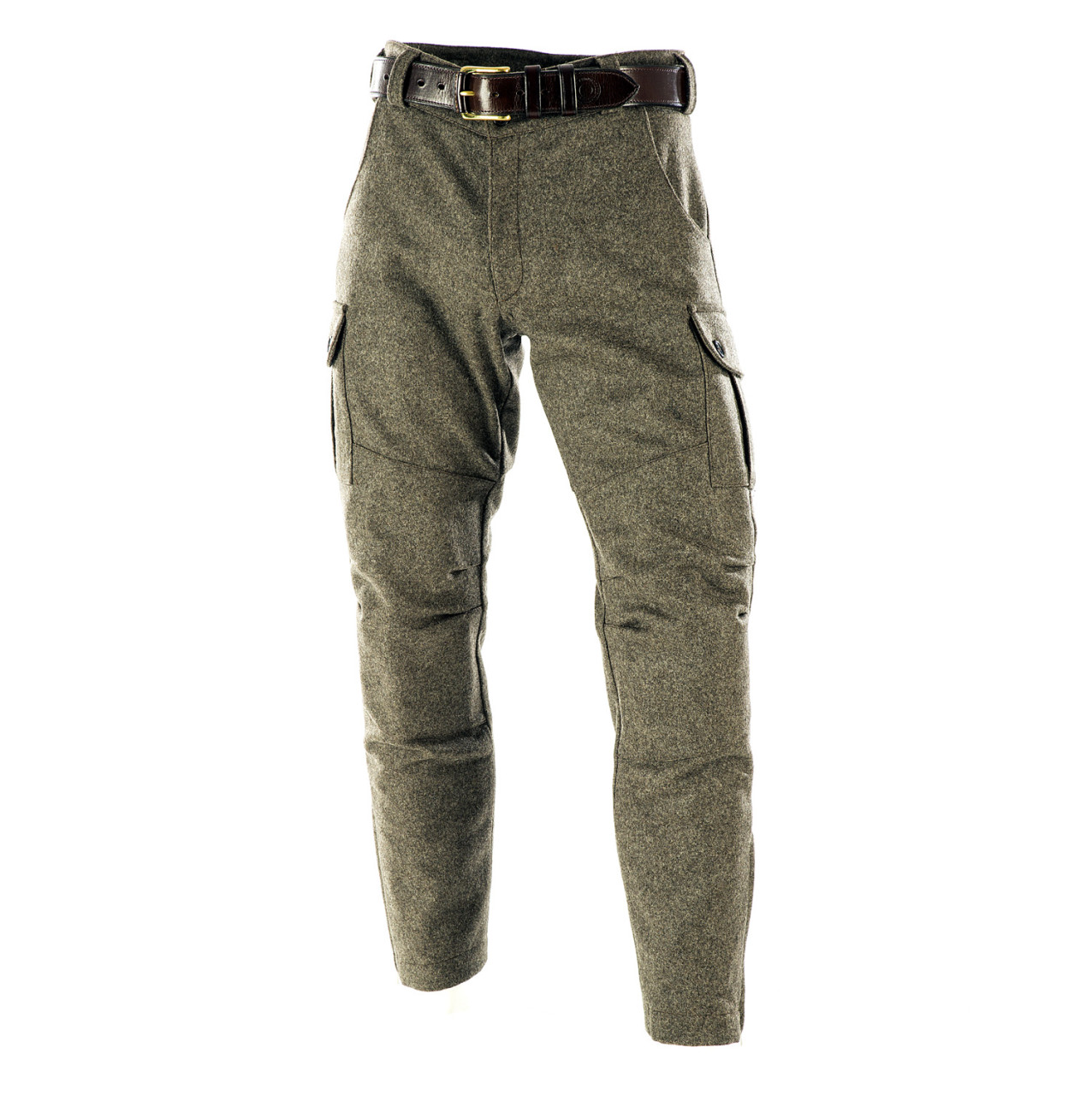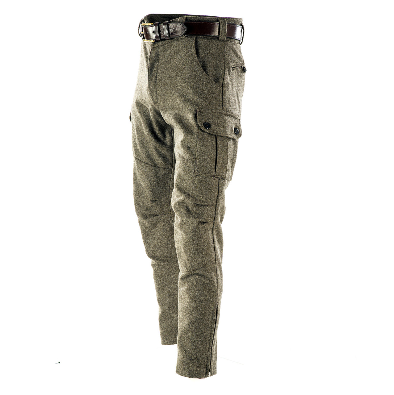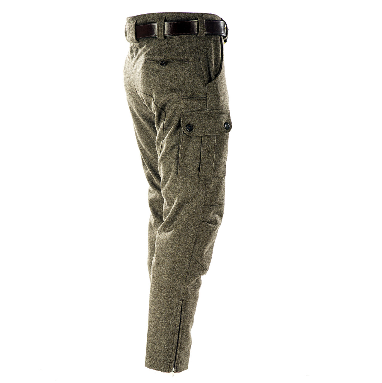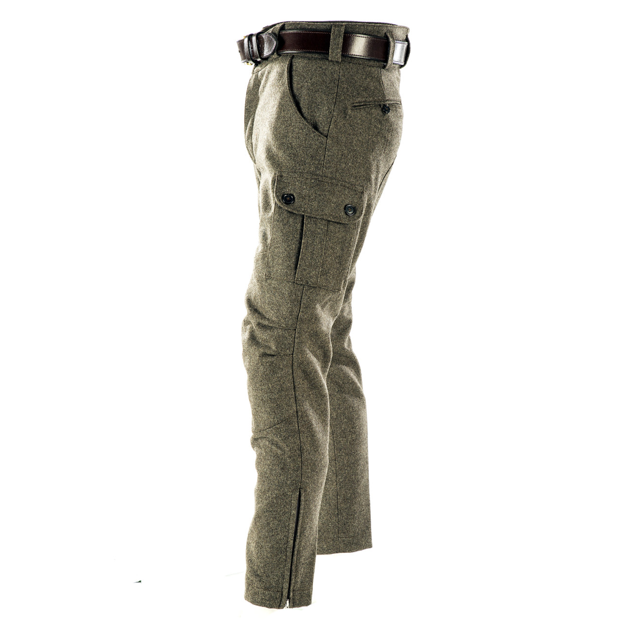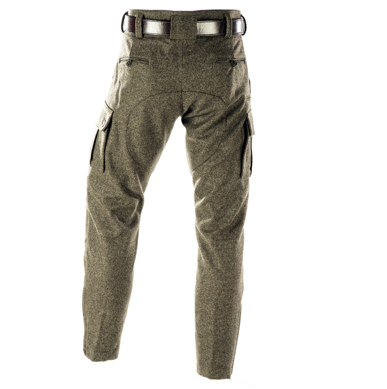 Stiefel Lodenhose - Seitentaschen - Paul & Kloosterhuis: klassische Steifelhose aus robustem Militär Loden im sportlichen Cargo-Schnitt. Die Stiefel Lodenhose hat schlank geschnittene Hosenbeine mit RV-Abschluss und ist speziell für die Nutzung von Schaftstiefeln, z.B. Gummi- oder Lederstiefel, ausgelegt. Genügend Stauraum bieten zwei Seitentaschen sowie eine Messertasche. Für mehr Tragekomfort sorgt der speziell-gearbeitete Kniebereich - zudem ist die Stiefel Lodenhose mit einem Baumwollfutter ausgestattet. Der dicht gewebte Tuchloden ist warm und äußerst strapazierfähig. Besonderheit der Loden-Stiefelhose ist die aufwendig gearbeitete Gesäß-Doppelung. Darüber hinaus besitzt die Lodenhose echte Horn-Knöpfe für die Anbringung von Hosenträgern. Die Loden-Stiefelhose: ein echter Klassiker in nahezu unverwüstlicher Qualität. Produziert wird die Lodenhose in Handarbeit - im Atelier in Coburg / Bayern. Maßanfertigung auf Anfrage.