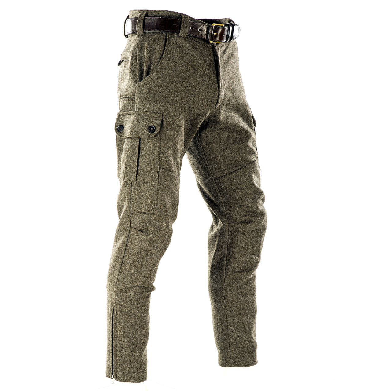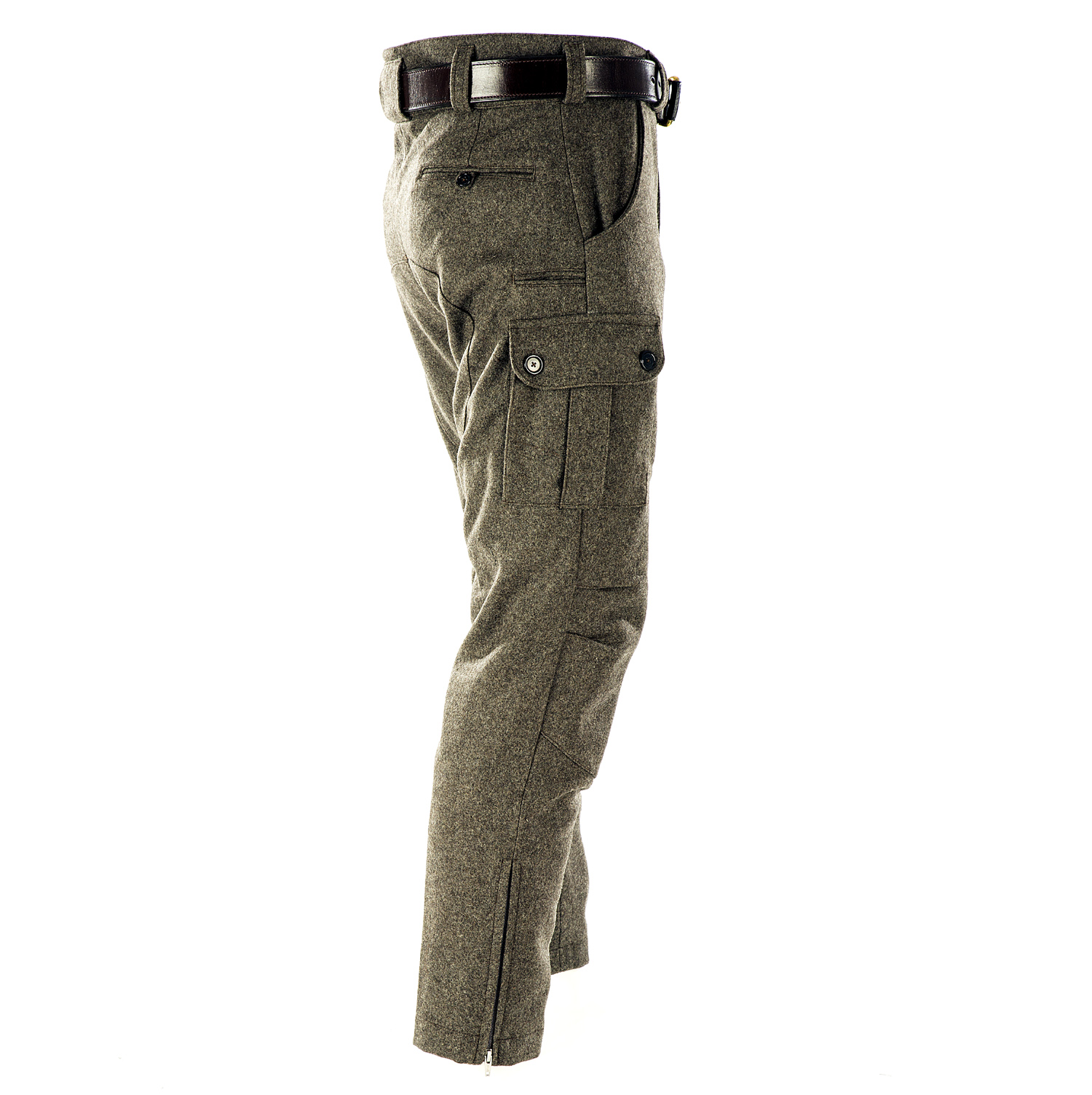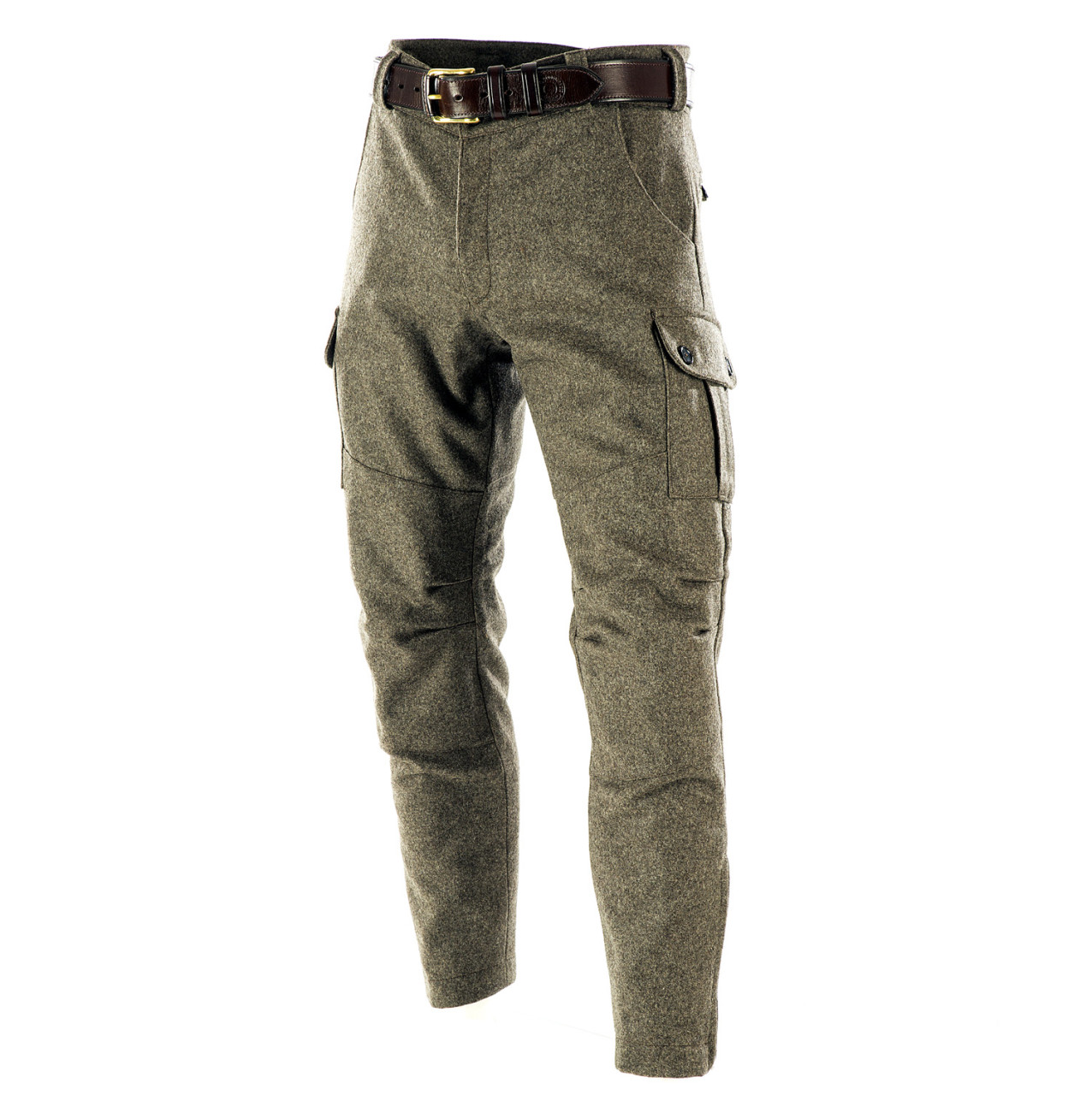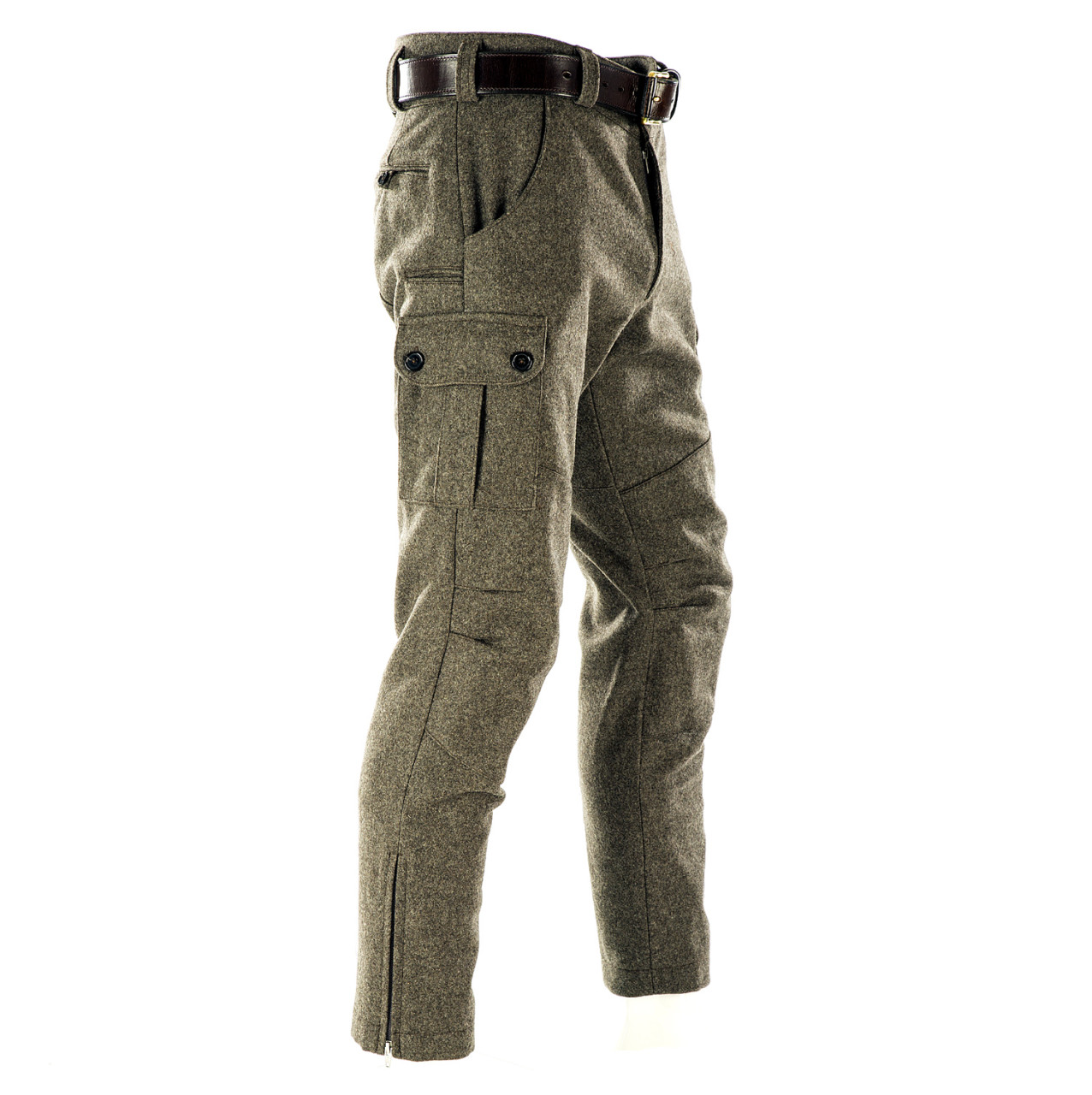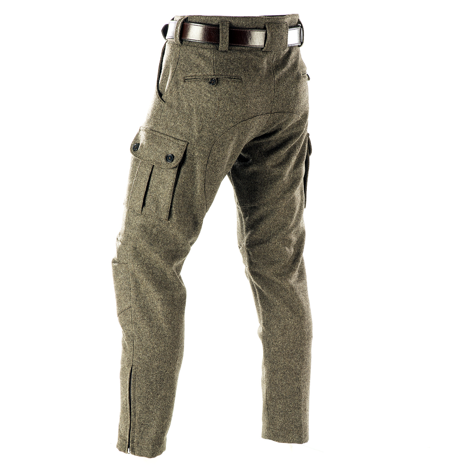 Stiefel Lodenhose - Seitentaschen - Paul & Kloosterhuis: klassische Steifelhose aus robustem Militär Loden im sportlichen Cargo-Schnitt. Die Stiefel Lodenhose hat schlank geschnittene Hosenbeine mit RV-Abschluss und ist speziell für die Nutzung von Schaftstiefeln, z.B. Gummi- oder Lederstiefel, ausgelegt. Genügend Stauraum bieten zwei Seitentaschen sowie eine Messertasche. Für mehr Tragekomfort sorgt der speziell-gearbeitete Kniebereich - zudem ist die Stiefel Lodenhose mit einem Baumwollfutter ausgestattet. Der dicht gewebte Tuchloden ist warm und äußerst strapazierfähig. Besonderheit der Loden-Stiefelhose ist die aufwendig gearbeitete Gesäß-Doppelung. Darüber hinaus besitzt die Lodenhose echte Horn-Knöpfe für die Anbringung von Hosenträgern. Die Loden-Stiefelhose: ein echter Klassiker in nahezu unverwüstlicher Qualität. Produziert wird die Lodenhose in Handarbeit - im Atelier in Coburg / Bayern. Maßanfertigung auf Anfrage.