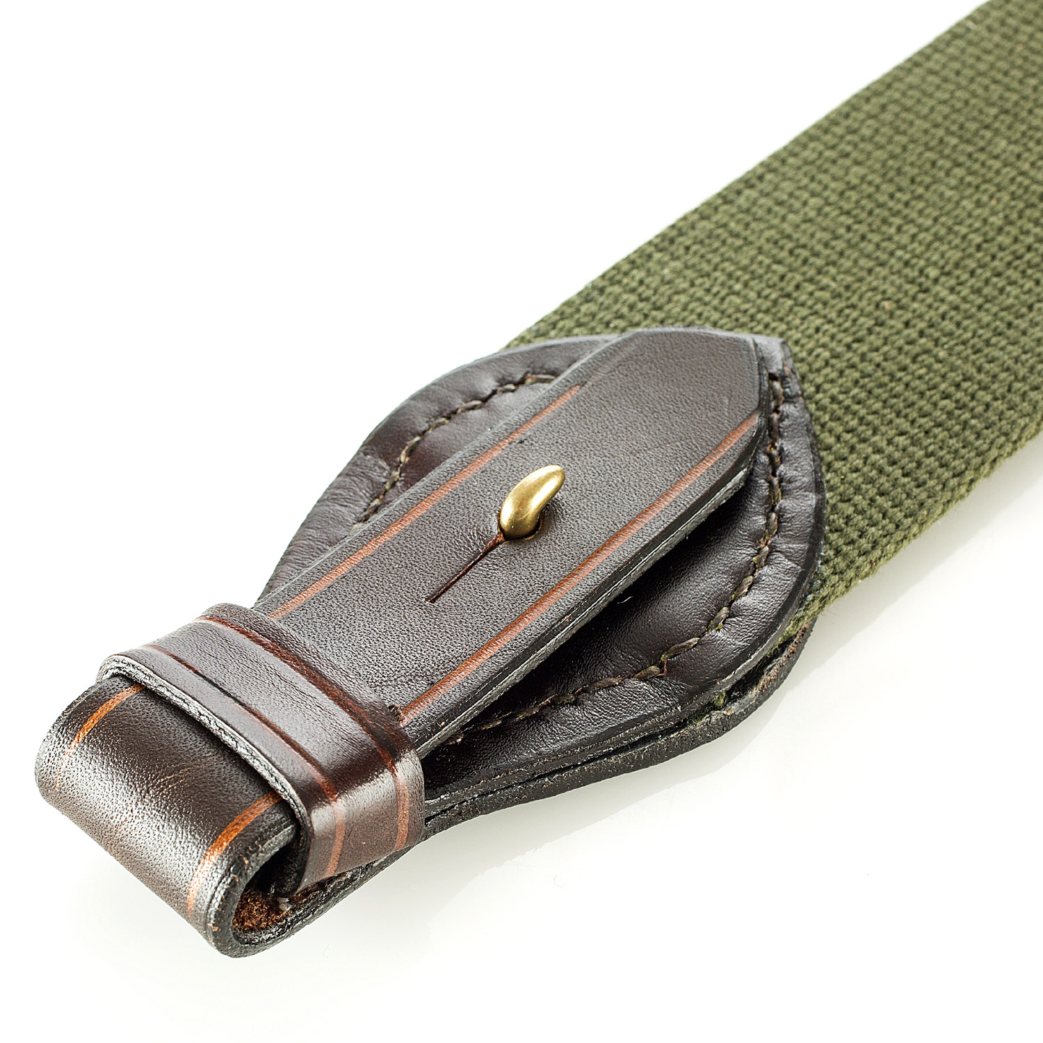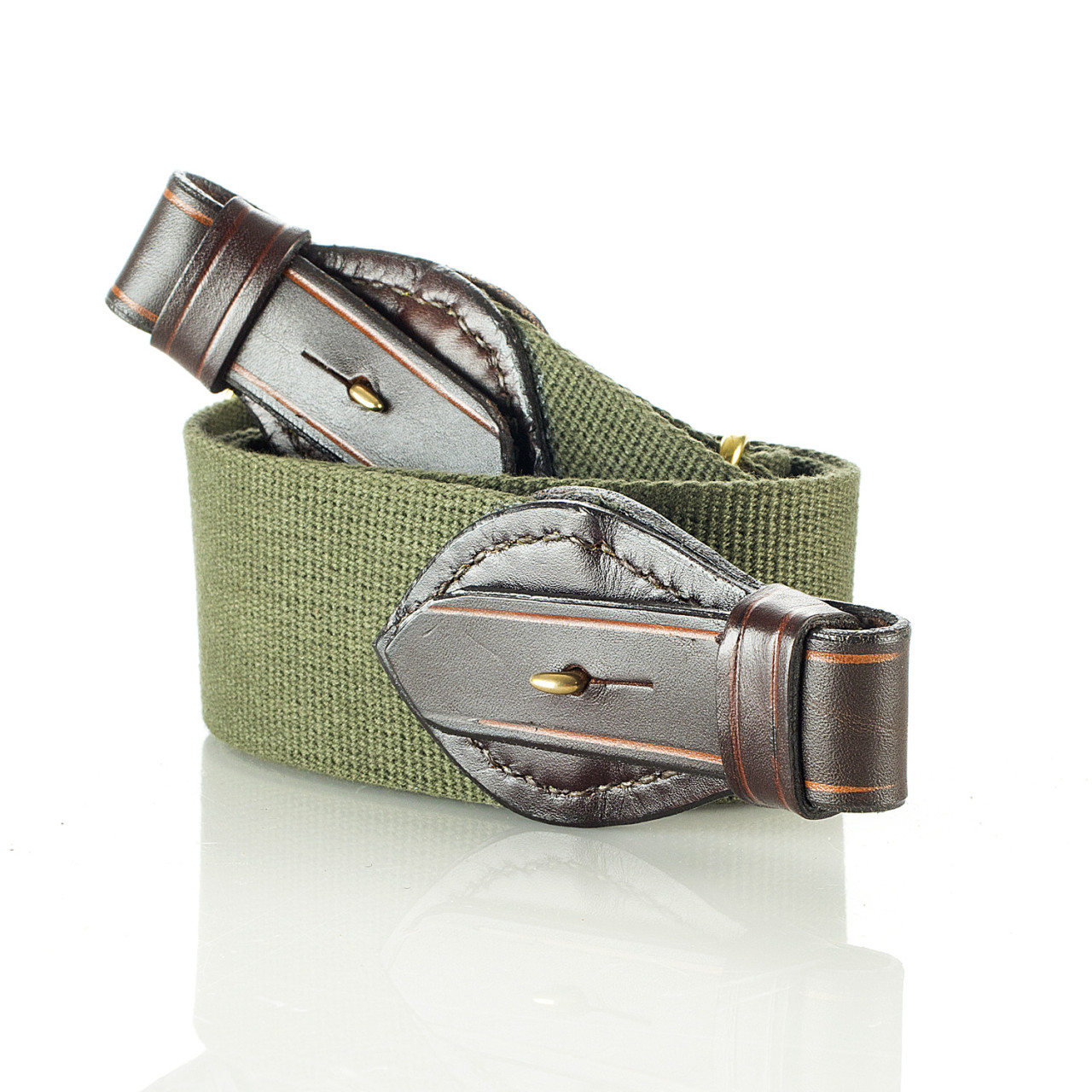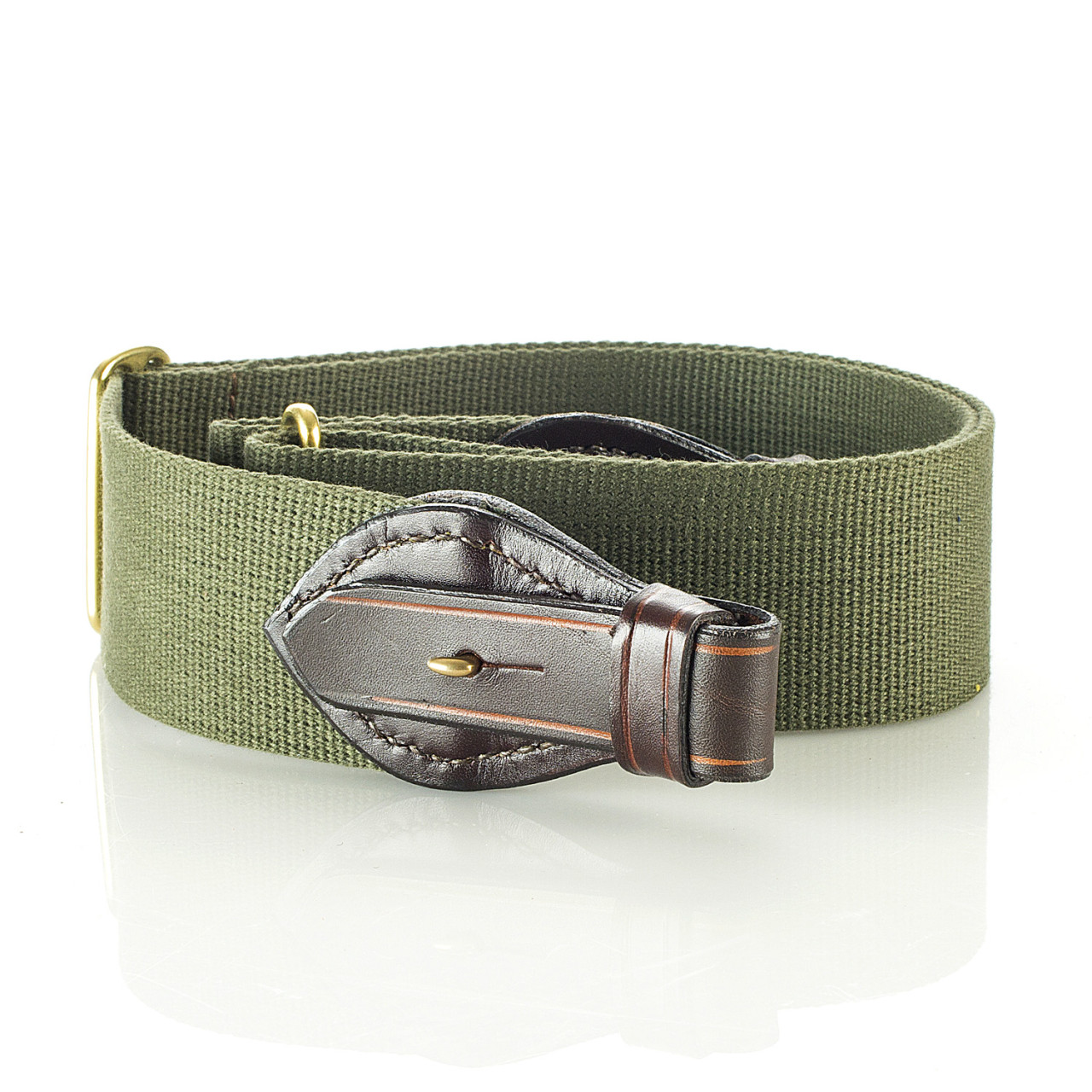 Paul & Kloosterhuis - Safari-Gewehrriemen - Oliv: klassischer Safari-Gewehrriemen im englischen Stil - aufwendig gefertigt in reiner Handarbeit - in unserer Sattler-Manufaktur in Coburg / Deutschland. Der Safari-Gewehrriemen wird aus traditionellen Materialien, so wie die Originale aus der Kolonialzeit, gefertigt: vegetabil gegerbtes und nahezu unverwüstliches Kern-Rindleder in einer Stärke von 5mm - dazu original englisches "Hard Wearing Canvas" höchster Gütequalität sowie original englische Messing-Beschläge aus einer kleinen Manufaktur, die auch das englische Königshaus beliefert. Die Lederteile werden von unserem Sattlermeister von Hand zugeschnitten und auch aufwendig von Hand vernäht. Das besondere Finish erhalten die Safari-Gewehrriemen über das liebevolle "aufputzen" der Kanten, das sorgfältige Kanten färben sowie über die farblich abgesetzten Linien-Zier-Phasen. Somit ist jeder Gewehrriemen ein besonderes Einzelstück - ein wertvolles Unikat. Ein Blickfang an jeder klassischen Jagdwaffe - nicht nur für eine Safari-Express-Rifle oder Side-By-Side - Doppelbüchse.